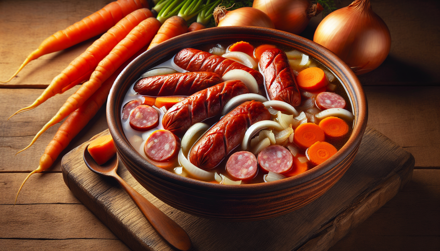 Ciorba cu cârnați afumați este o rețetă simplă, dar extrem de savuroasă. Aceasta combină morcovii dulci și ceapa suculentă cu gustul picant și afumat al cârnaților. Fiind o ciorbă, ea este, de obicei, acrișoară, având la bază un lichid acru cum ar fi borșul sau zeama de lămâie, care balancează frumos grăsimea cârnaților. În plus, cârnații afumați oferă o consistență plăcută, făcând această supă nu doar delicioasă, dar și extrem de sățioasă.