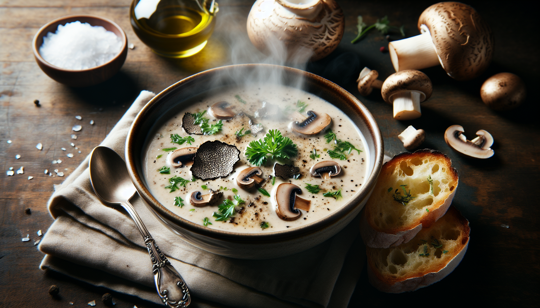 Aspectul său, adesea decorat cu felii subțiri de trufe și o picătură de ulei de trufe, face din supa-cremă de ciuperci și trufe un adevărat deliciu vizual. Nu doar că încântă privirea, dar aduce și o experiență olfactivă sublimă, aromele pământii amestecându-se armonios cu notele subtile ale trufelor. Mai mult, această supă nu este doar o încântare pentru simțuri, ci și pentru sănătate, datorită proprietăților nutritive ale ciupercilor și impactului benefic al trufelor asupra organismului. Preparatul nu este foarte complicat de realizat, dar fiecare pas necesită atenție și grijă pentru a obține un rezultat perfect, fiind astfel o provocare plăcută pentru orice pasionat de gătit.