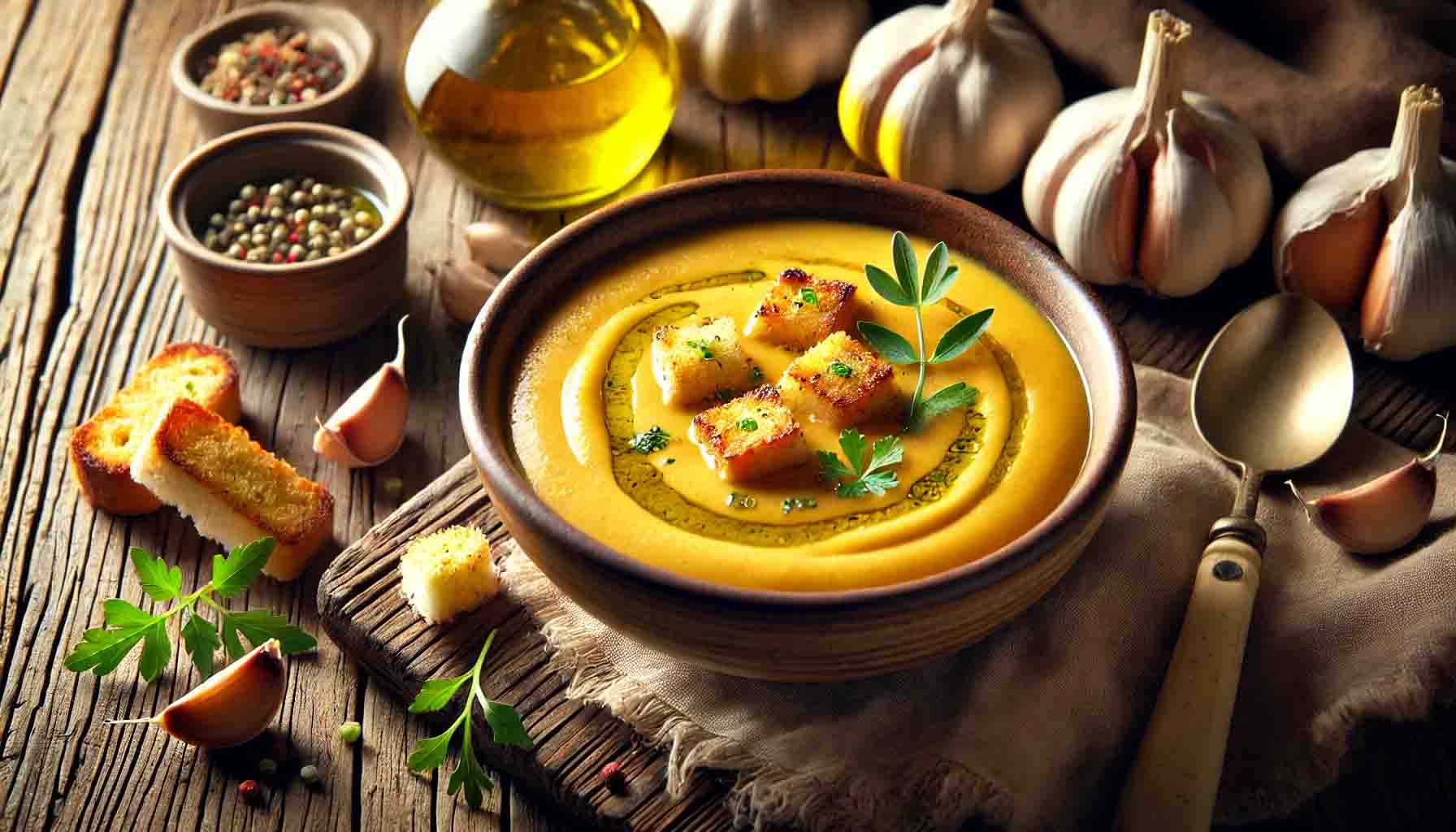 Supă-cremă de usturoi copt este un deliciu culinar care îmbină aroma intensă și specifică a usturoiului cu textura fină și catifelată a unei supe-creme. Este o alegere perfectă atât pentru iubitorii de usturoi, cât și pentru cei care doresc să încerce o supă neobișnuită, dar plină de arome. Acest preparat este potrivit pentru serile răcoroase, când o porție de supă caldă și aromată poate aduce un plus de confort și satisfacție. Usturoiul copt devine mai dulce și mai blând decât cel crud, contribuind la un gust echilibrat și plăcut al supei.