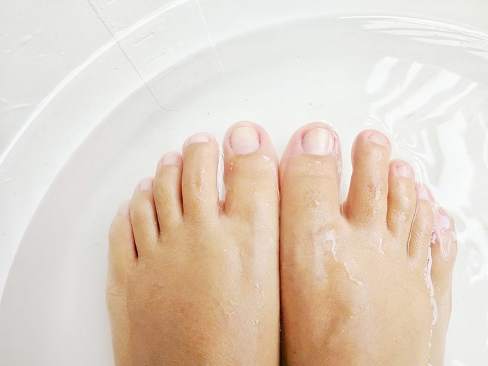 Umpleți o cadă sau un lighean mare cu apă caldă suficientă pentru a acoperi picioarele până la nivelul gleznelor.