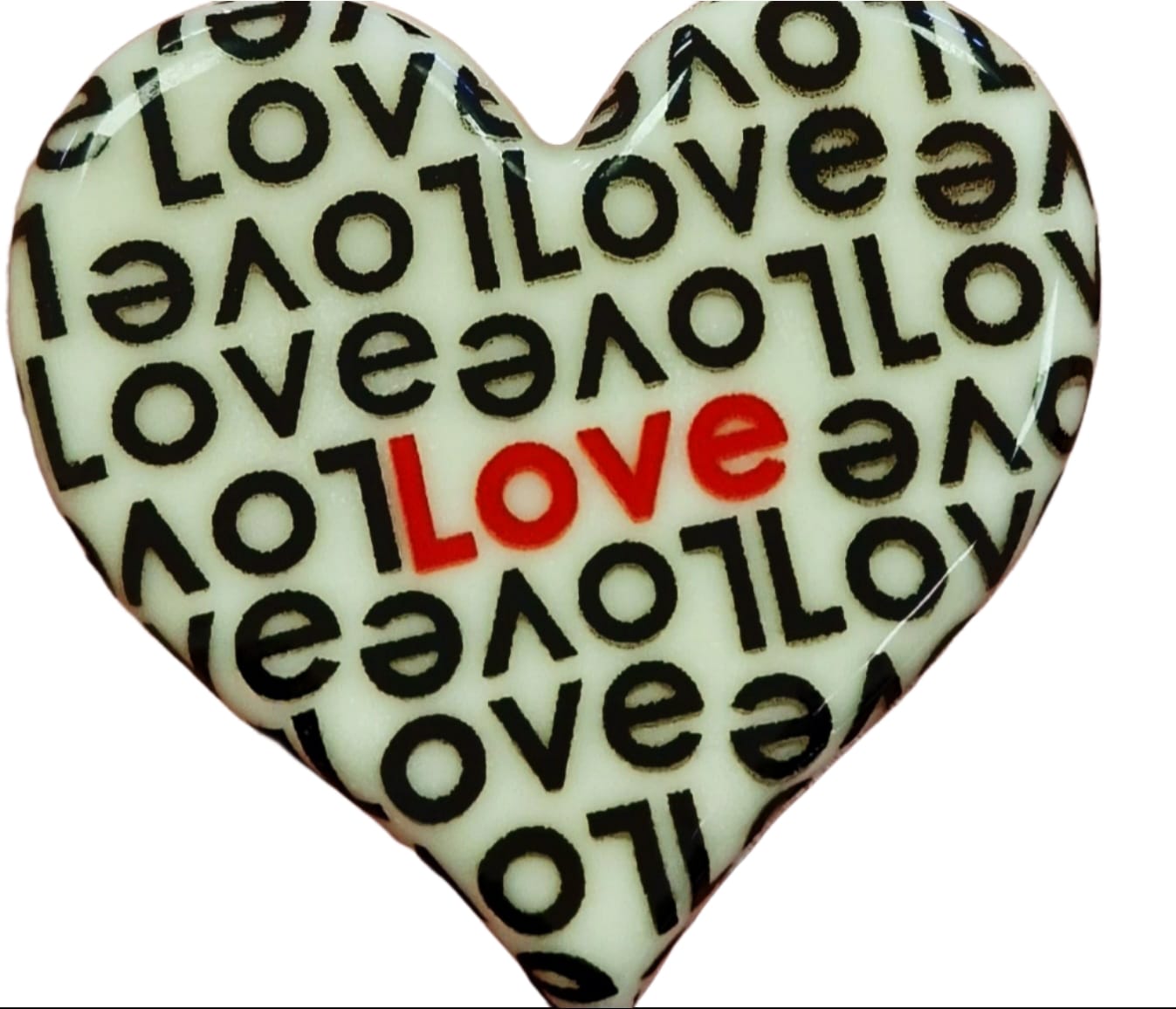 Decoratiune Ornament Ciocolata Alba - Model Inima Cu Mesaj Love - Alb & Negru & Rosu – 43 mm x 45 mm - Cutie - 288 bucati -VG.CD.KLP 016