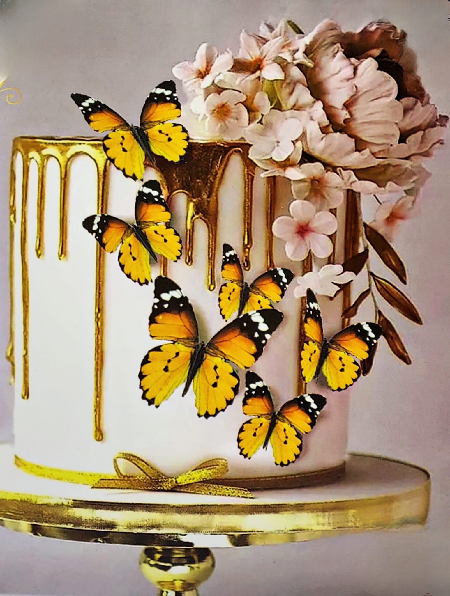 - Pentru decoruri complexe puteți utiliza fluturii de hartie impreuna cu alte decorațiuni comestibile, cum ar fi flori sau fructe, pentru a adăuga un plus de culoare și textură tortului
