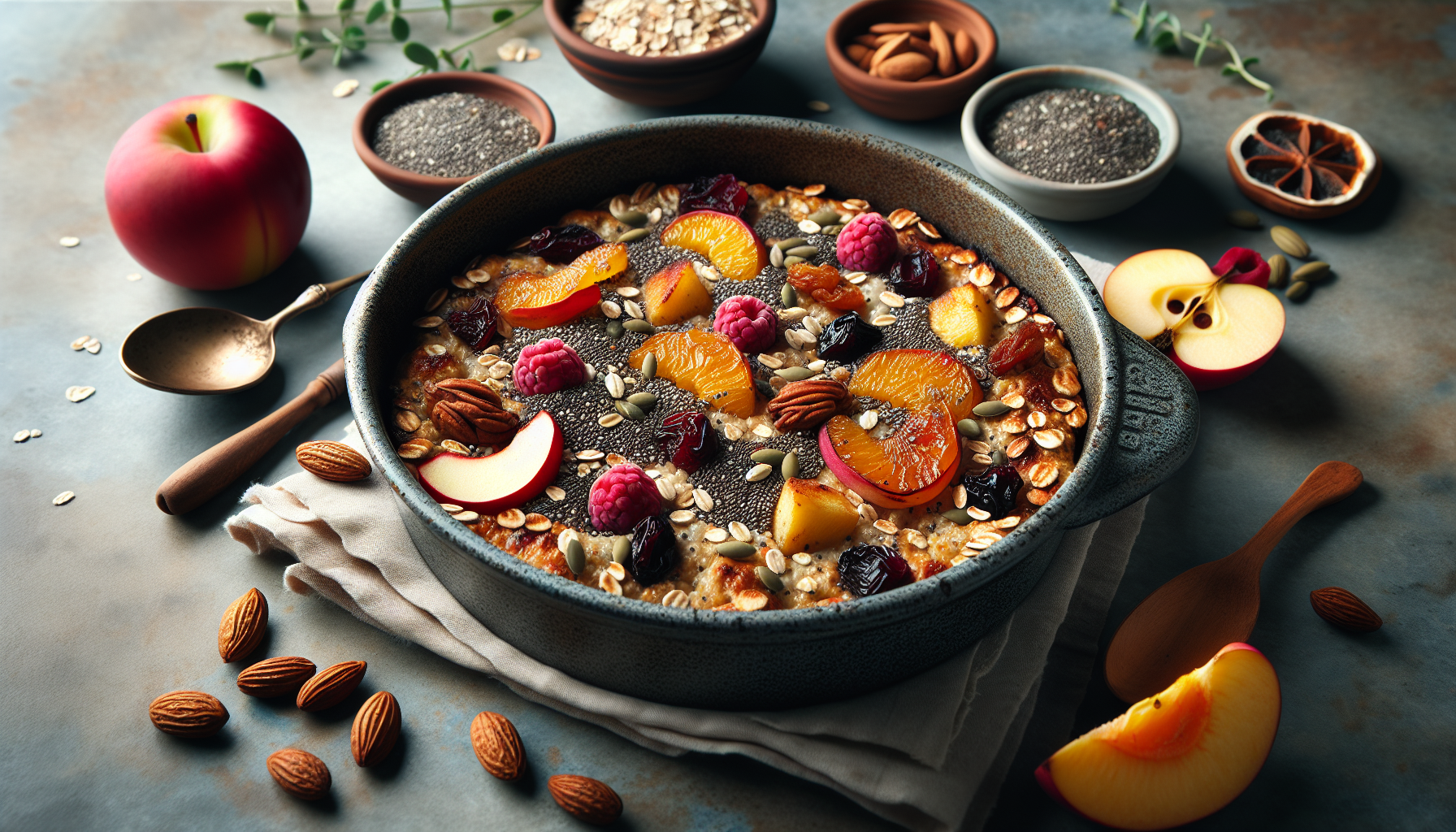 Ovăzul la cuptor cu semințe de chia și fructe uscate este un preparat sănătos și delicios, perfect pentru micul dejun sau ca gustare între mese. Ovăzul este o sursă bogată de fibre, iar semințele de chia adaugă un plus de proteine și acizi grași omega-3. Fructele uscate aduc o notă dulce și o consistență plăcută. Acest preparat este ușor de făcut și poate fi adaptat după preferințe, schimbând tipurile de fructe uscate sau adăugând alte ingrediente, cum ar fi nuci sau migdale.