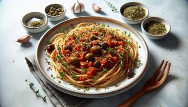 Descriere Spaghete alla puttanesca este un preparat tradițional italian, cunoscut pentru combinația sa vibrantă de ingrediente pline de gust și arome. Această variantă a rețetei include adăugarea de oregano și usturoi granulat, care îmbogățesc și mai mult profilul aromatic al sosului. Perfectă pentru o cină rapidă, dar savuroasă, aceasta rețetă este...