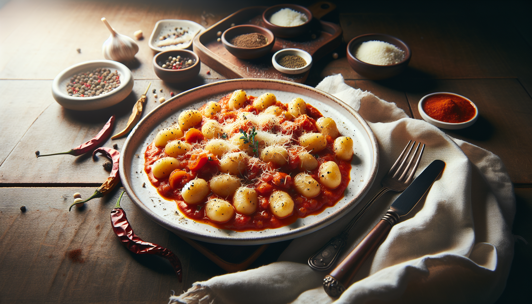 Gnocchi cu sos de roșii, oregano și chili este o rețetă italiană clasică, revigorantă, plină de arome și culori, perfectă pentru o cină sățioasă sau un prânz de weekend alături de familie și prieteni. Textura moale și pufoasă a gnocchilor se îmbină armonios cu intensitatea și picăntura sosului de roșii, având ca rezultat un preparat confortant și delicios.
