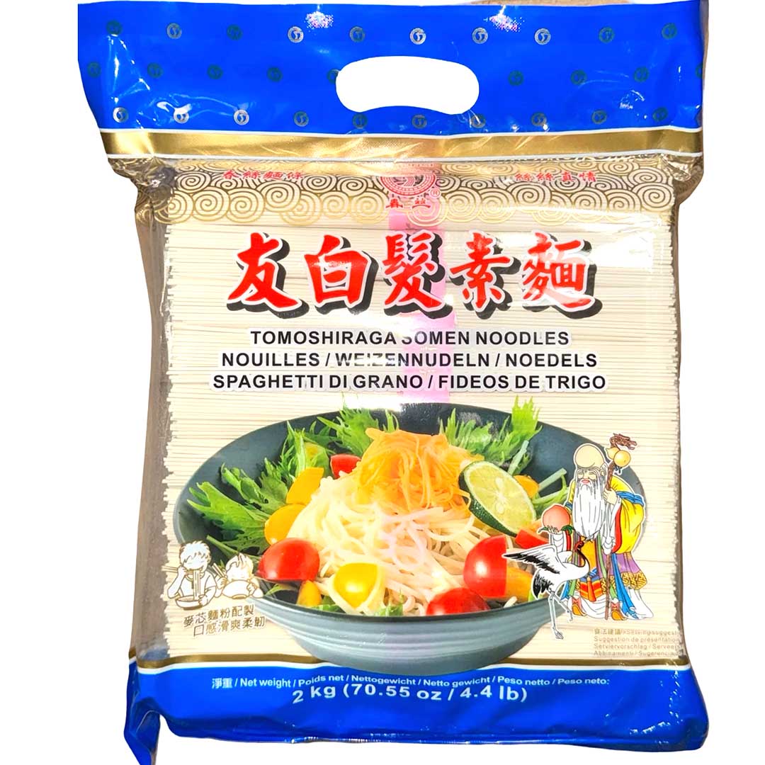 Tomoshiraga Somen Noodles 2 kg se prezintă sub forma unor legături ordonate de tăiței albi, drepți și subțiri, ambalați igienic într-un pachet generos, ideal pentru utilizare profesională sau gospodării care gătesc frecvent.