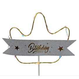 Topper Led - Mesaj "Happy Birthday"- Coroana - Galben / Auriu - Plastic- A 13436