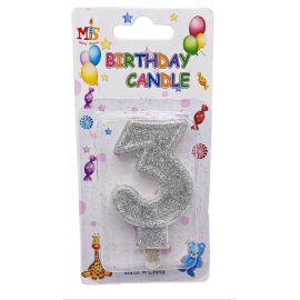 Birthday Candle - Lumanare Tort – Aniversare - Cifra 3 – Alb & Argintiu & Glitter