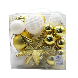 Set 30 Globuri & Varf Brad Stea – Auriu & Alb - Plastic – Modele & Dimensiuni Vari...