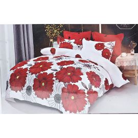 Set Lenjerie- Pat Dublu- Set 4 Piese - Model Crizanteme Mari Rosii- Culoare Alb & ...