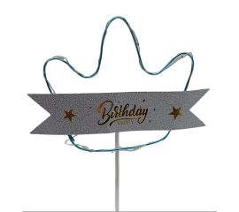 Topper Led - Mesaj "Happy Birthday" - Coroana - Albastru - Plastic- A13436